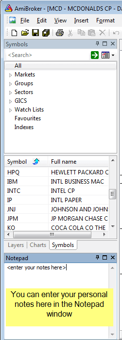 Notepad window (that you can show/hide using Window->Notepad menu)