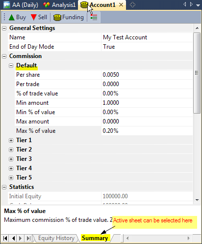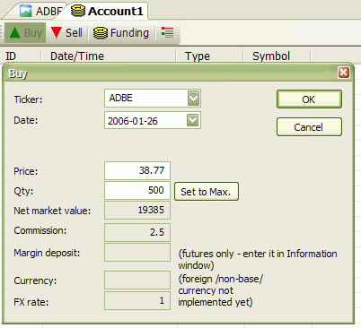 It is a good idea to go to "Summary tab" and set up commissions and trading mode. If this account is used for End-of-day trading, you should set "EOD Mode" to YES, otherwise (if you trade intraday), you should set "EOD Mode" to NO. Depending on this setting, Buy/Sell dialogs will allow you to enter date and time of the trade or only date.