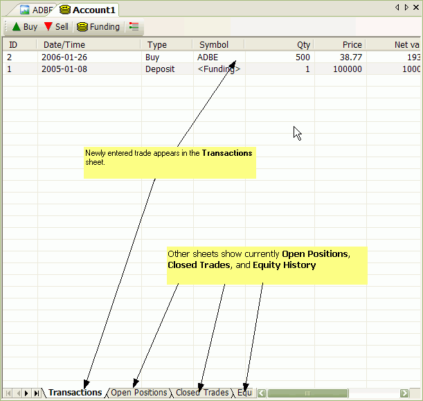 All transactions that you have made are listed in the "Transactions" sheet. All open positions are listed in the "Open Positions" sheet. If you enter the trade for a symbol that has a position already open, AmiBroker will adjust "Open Positions" accordingly (perform scaling in/out). Once an open position is closed, it is removed from the "Open Positions" list and moved to the "Closed Trades" sheet.