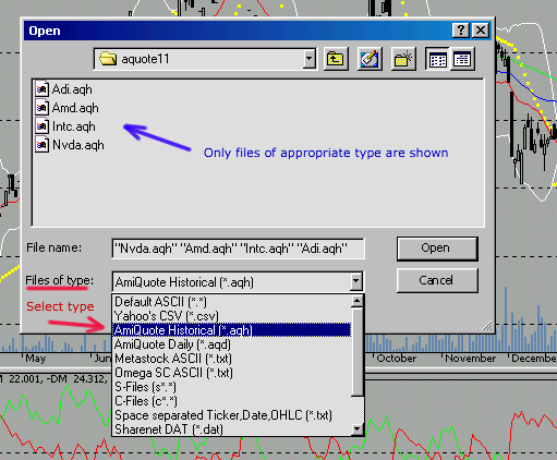In this picture, I have marked the most important items for easy identification. Marked in red is the type selector combo-box ("Files of type"). In order to import AmiQuote files (those with .AQH and .AQD extensions), you should choose AmiQuote Historical or AmiQuote Daily, or AmiQuote Intraday (.AQI), or AmiQuote MSN (.AQM), or AmiQuote eSignalCentral (.AQE) from the combo box (the red arrow shows these options).
