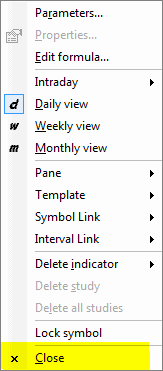 To remove the indicator, press the Close button from the menu at the top right-hand side of the indicator pane (the menu will be displayed if you place the mouse cursor nearby). This menu also allows you to move the indicator pane up/down or maximize the pane.
