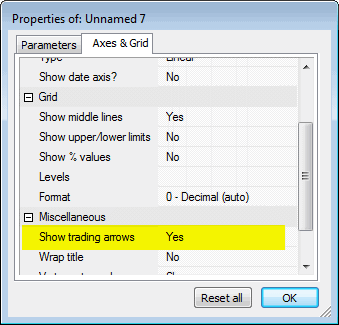 A. Trade arrows can be displayed on any chart pane (not only the built-in price chart). However, by default, the arrow display is turned OFF. To turn it ON, you have to open the Parameters dialog, switch to "Axes and grid" and switch the "Show trading arrows" option to "Yes".