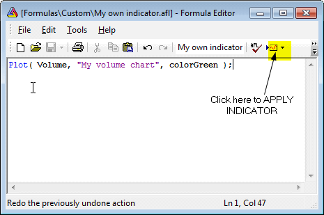 The second method involves writing an indicator formula in flexible AFL (AmiBroker Formula Language). You can find a description of this language in the AFL Reference Guide section of the user's guide. Here we will present the basic steps needed to define and display your own custom indicator. In this example, we will define an "indicator" that will show a line volume graph (opposite to the built-in bar volume graph).