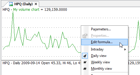 Now you can improve your indicator by adding Param functions so that both the color and style of the plot can be modified using the Parameters dialog. To do so, click with the RIGHT mouse button over the chart pane and select "Edit Formula" (or press Ctrl+E)