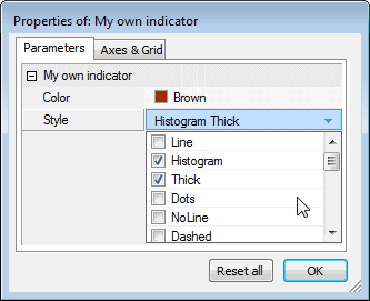 Then press "Apply indicator" to apply the changes. Now click with the RIGHT mouse button over the chart pane again and select "Parameters" (or press Ctrl+R), and you will see the Parameters dialog allowing you to modify colors and styles used to plot a chart: