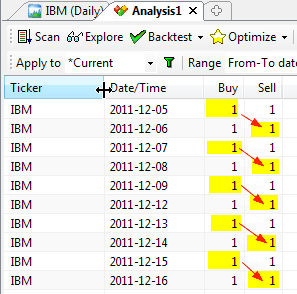The following pictures show which signals are taken and the resulting trade list. As we can see, this time all signals are acted upon and we have a sequence of single-bar trades.
