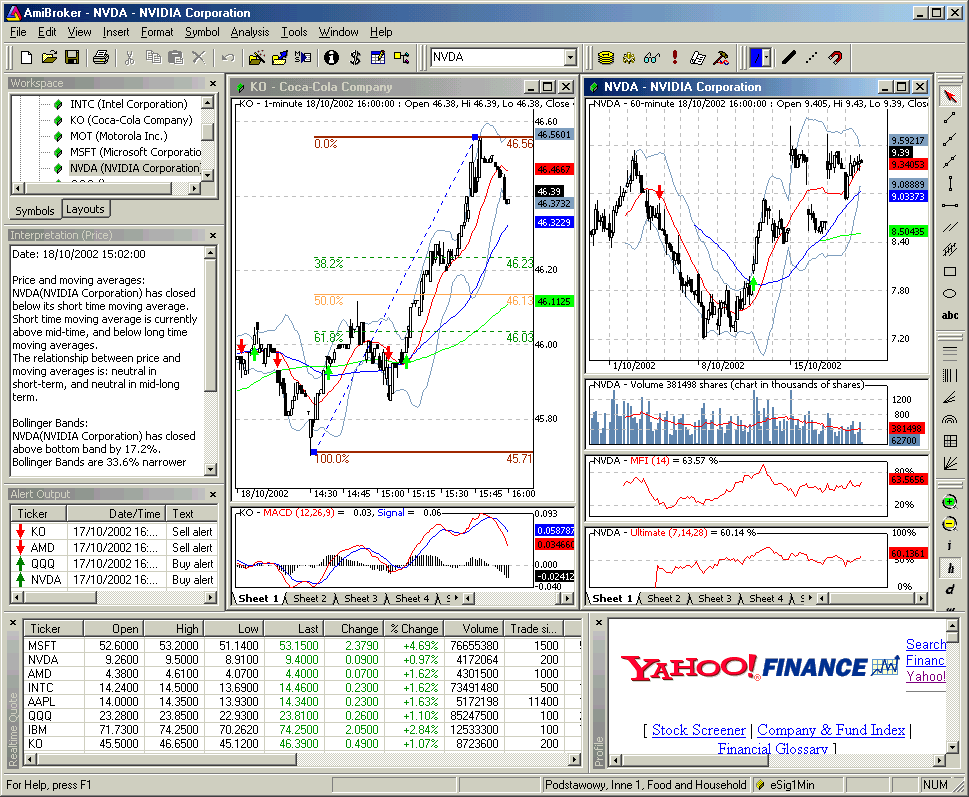 As shown in the above example, the template URL can contain special fields that are substituted at run time by values corresponding to the currently selected symbol. The format of the special field is {x} where x describes the field type. Currently there are five allowable field types: ticker symbol in original case {t}, ticker symbol in lowercase {s}, ticker symbol in UPPERCASE {S}, alias {a}, web ID {i}. You can specify those fields anywhere within the URL, and AmiBroker will replace them with appropriate values entered in the Information window. You can also reference single characters of a ticker, alias, or web ID. This is useful when a given web site uses the first characters of, for example, a ticker to group the HTML files (Yahoo Finance site does that), so you have files for tickers beginning with 'a' stored in subdirectory 'a'. To reference a single character of the field, use the second format style {xn} where x is the field type described above and n is zero-based index of the character. So {a0} will evaluate to the first character of the alias string. To get the first two characters of a ticker, write simply {t0}{t1}. A note about the web ID field: this new field in the Information window was added to handle situations where web sites do not use ticker names for storing profile files. I found some sites that use their own numbering system, so they assign a unique number to each symbol. AmiBroker allows you to use this nonstandard coding for viewing profiles. All you have to do is to enter the correct IDs in the Web ID field and use an appropriate template URL with the {i} keyword.