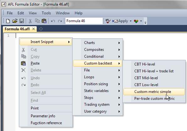 In version 5.90, code snippets are also available in the auto-complete list in the AFL editor. Just type '@' followed by the first letter of a snippet's key trigger, and the auto-complete list would show you the list of available snippets that have keyboard triggers defined starting with that letter.