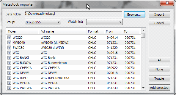 Metastock importer opens AmiBroker to a very rich source of historical data. The importer supports both old Metastock 6.5 and new 7.x (XMASTER) formats.