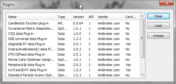 In addition to just showing the list of plug-ins, you can unload all DLLs by pressing the "Unload" button and load them back by pressing the "Load" button. Please note that a DLL must be placed in the "Plugins" subfolder of the AmiBroker main directory to be seen.