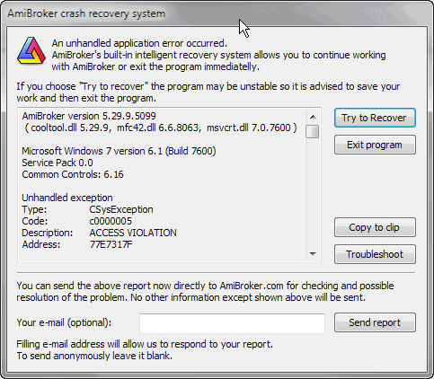As you can see, there is a window that displays important system information, and there are five buttons: Try to recover, Exit program, Copy to clip, Troubleshoot, and Send report. Clicking the Exit program button works exactly the same as clicking the "OK" button in the standard Windows dead-end message box. However, the Try to recover button offers brand new possibilities. If you click the Try to recover button, AmiBroker will try to recover from the error and continue running. In most cases, you will be able to save your work and modifications you have made, so you will not lose anything. In fact, you will be able to work normally. There are, however, some cases where recovery will not succeed, and AmiBroker may be unstable, so it is advised to just save your data and exit. It may also happen that this window will pop up a couple of times; then you should just click the Try to recover button several times. Copy to clip copies bug report details with system information to the clipboard, so you can paste this information into an e-mail program and send it to us.